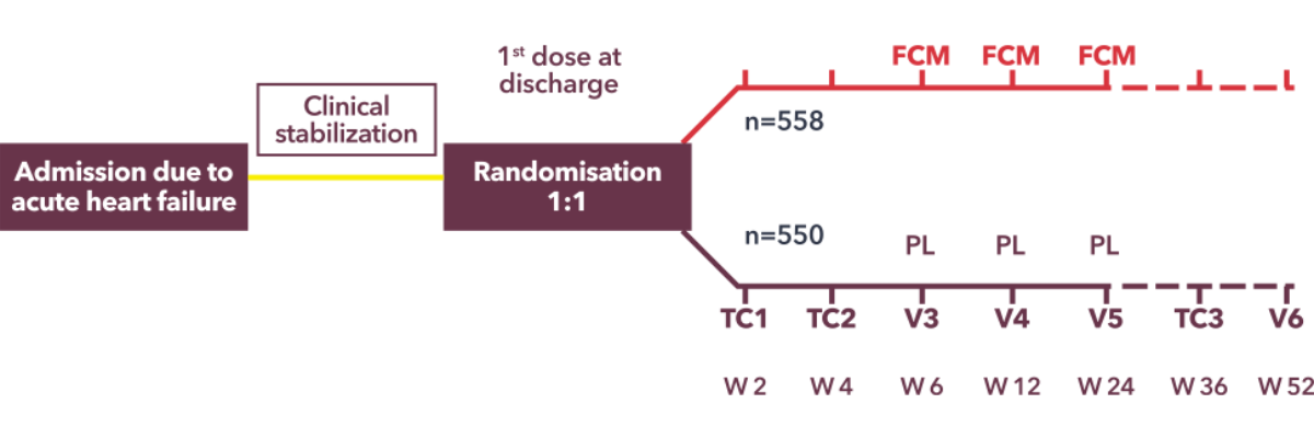 Affirm-AHF was designed assess intravenous ferric carboxymaltose among patients who were hospitalized for acute heart failure and iron deficiency. This was a randomized, parallel, placebo-controlled, double-blind clinical trial done at 121 sites in Europe, South America, and Sigapore. The study design is described in the figure below.