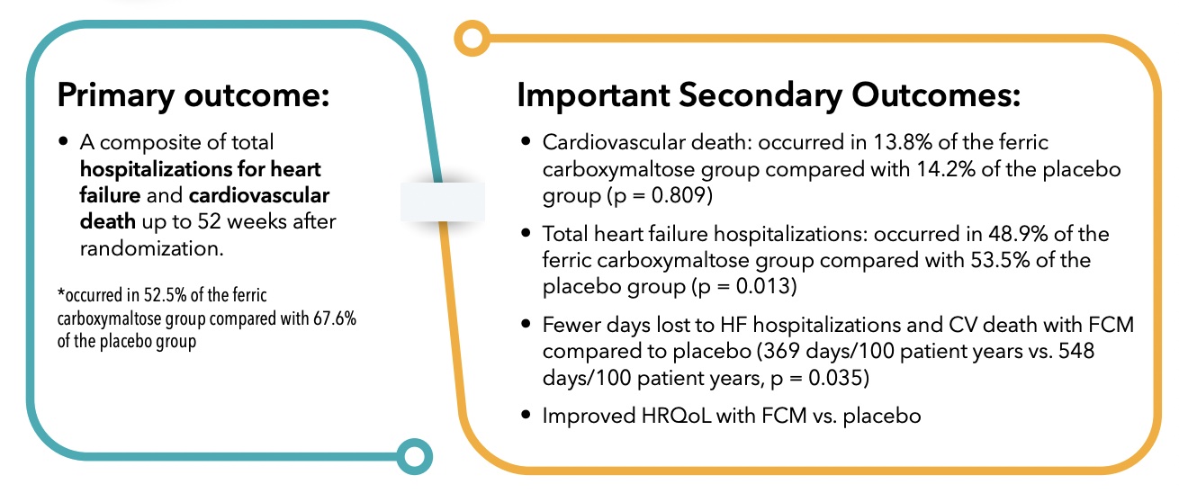 - Fewer days lost to HF hospitalizations and CV death with FCM compared to placebo (369 days/100 patient years vs. 548 days/100 patient years, p = 0.035)